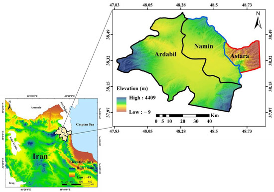 The study area, extending between 47°48′ and 48°41’ E and 37°56′ and 38°37′ N latitude, includes the cities of Ardabil, Namin, and Astara, covers approximately 3284 km2 on the western coast of the Caspian Sea, in northwest Iran (Figure 1). The meteorological and topographical features are presented in Table 1 across the study regions. The temperature and precipitation vary across regions (Table 1). The maximum and minimum temperatures recorded in Astara and Namin are 29.7 and −6.6 °C, respectively; Astara and Ardabil receive the maximum and minimum precipitation of 1328 and 307 mm, respectively.