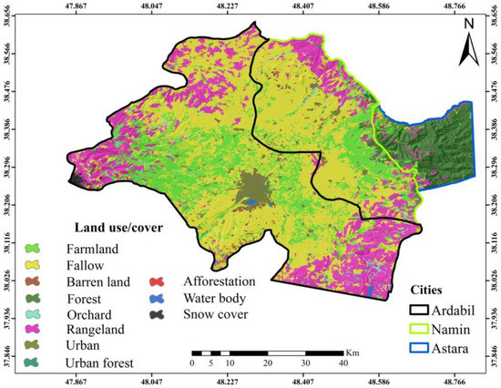 Figure 2 shows the LULC map of the study area in 2019. The results of the accuracy assessment revealed a kappa coefficient of 0.91 and overall accuracy of 0.93, which indicated the strong ability of the object-oriented algorithm to capture the LULC patterns of the region based on the field samples. In Figure 2, fallow (64,247.4 ha) and afforestation (127.7 ha) were the largest and smallest LULCs of the study area, respectively (Table 2).