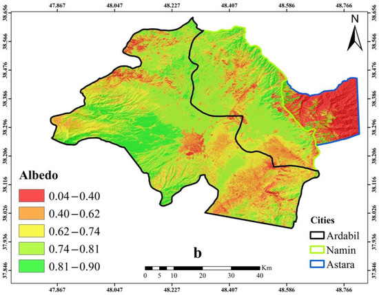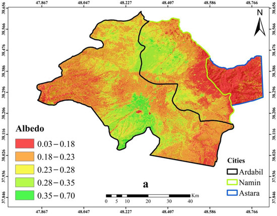 Global warming refers to the impact of human-induced activities on the atmosphere, particularly the consumption of fossil fuels (coal, oil, and gas) and large-scale land degradation and deforestation, which have rapidly increased since the industrial revolution [1,2,3]. There are increasing concerns regarding global warming, which has led to floods in some parts and prolonged droughts in other parts of the world [4,5,6], leading to crop decline and famine, which have ultimately caused major socioeconomic crises. Due to its complicated nature, which arises from the simultaneous effects of different drivers, investigation and, more importantly, prediction of the likelihood of global warming behavior remain challenging [7,8,9]. Greenhouse gases and solar radiation reflection, called albedo, both contribute to affecting the Earth’s surface temperature. Albedo is the parts of solar radiation reflected by the Earth, which is a function of terrestrial features, material, and the amount of solar energy absorbed by objects on the Earth’s surface [10]. Due to topographic complexities, in-suite measurement of albedo is usually challenging, where satellite measurements are widely used for its calculation. Through albedo, the net energy received from different land use/land cover (LULC) is captured [11].