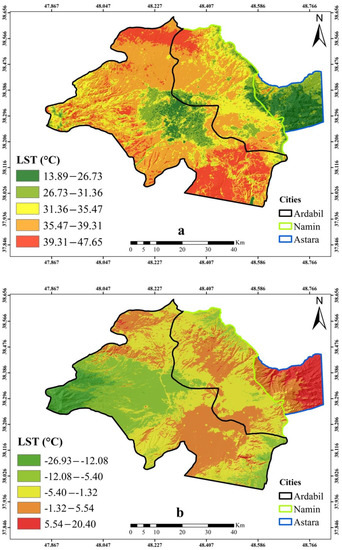 Figure 4 depicts the developed maps for LSA in summer and winter. According to this figure, the maximum and minimum temperatures of 47.65 °C and −26.93 °C were estimated for the region in summer and winter, respectively. Table 3 presents the values for LSA and LSA, individually, across the different LULCs in two study periods. According to this table, the maximum and minimum values of LSA were associated with farmland (0.84) and water bodies (0.11), respectively.