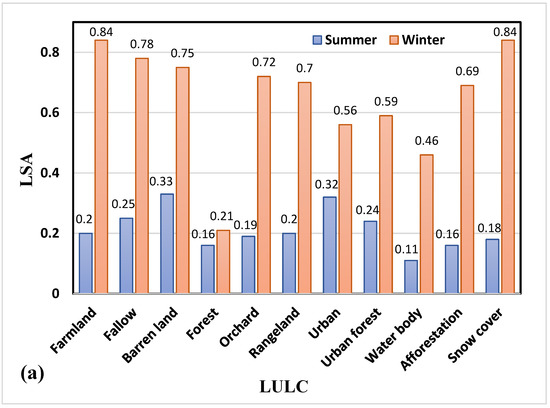 Figure 3 shows the LSA maps of the study area for the summer and winter seasons. It is evident that LSA values were high during winter compared with during the summer. Hence, the values of 0.04–0.90 and 0.03–0.70 were estimated during winter and summer, respectively. According to the LSA map (Figure 3a), the low values (0.03–0.28) in summer mostly came from the LULCs that covered the majority of the region. In winter (Figure 3b), the high values (0.62–0.90) were from the LULCs that covered a substantial area in the region.