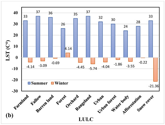 According to the results, the maximum and minimum LST values in summer were obtained from fallow land associated with rangeland and water bodies, respectively. In winter, forests and snow cover showed the highest and lowest LST, respectively. This finding is in accordance with that of Nadizadeh Shourabeh et al. [46], who indicated a high average temperature of fallow land during 1992–2015. Additionally, we obtained the minimum LST from water bodies, which is in line with the findings of Feizizadeh et al. [47]. These results can be attributed to the nonuniformity of fallow land, which is a combination of grass, plants, and soil surface that causes the largest temperature variation on the ground [46]. Merga et al. [48] investigated the LST changes in response to LULC dynamics in the Didsa River sub-basin in western Ethiopia, and showed that the highest LST values were on bare land, settlement areas, and farmland, whereas forests and water bodies had the lowest LST. It should be kept in mind that all these results should be interpreted in light of biophysical factors (e.g., solar radiation intensity, surface moisture, wind speed, and humidity), which may not have been stable or stationary during the timeframes when the data were collected [49].