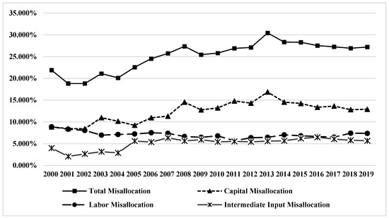 It can be seen from Table 3 that from 2000 to 2019, the resource misallocation among the energy industries in the upper, middle, and lower reaches of the Yangtze River Economic Belt has significant regional heterogeneity. Among them, the resource misallocation among the upstream, midstream, and downstream provinces is increasing in turn; that is, the resource misallocation level of the downstream provinces is the highest, followed by the midstream, and the upstream is the lowest. The capital misallocation in the midstream and upstream provinces is significantly higher than the labor misallocation and the intermediate input misallocation, while the capital misallocation in the downstream provinces is lower than the labor misallocation in 2001, and since 2011, the capital misallocation has exceeded the labor misallocation. Among the downstream provinces, the resource misallocation among the energy industries in Shanghai is the most serious, and its total misallocation, capital misallocation, and intermediate input misallocation are increasing year by year, while the labor misallocation is easing year by year. At the same time, the intermediate input misallocation has also risen rapidly since 2011 and exceeded the capital misallocation and labor misallocation, which has become the main cause of resource misallocation among energy industries in downstream provinces, while the intermediate input misallocation in midstream and upstream provinces has always been at a low level. Among the provinces in the Yangtze River Economic Belt, only the resource misallocations among the energy industries in Hunan and Chongqing have been alleviated year by year, while the rest of the provinces have been increasing or fluctuating horizontally year by year, which fully demonstrates the necessity and urgency of correcting the resource misallocation between the energy industries in the Yangtze River Economic Belt.