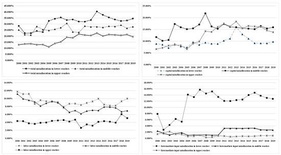 The misallocation of energy industry resources in the upper, middle, and lower reaches of the Yangtze River Economic Belt from 2000 to 2019.