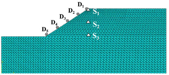In order to study the influence of EPA on the dynamic displacement response and stress response of slope under earthquake action, a two-dimensional soil slope model (Figure 1) has been established by reference to the layout control of slope monitoring points [31]. Five displacement observation points D1-D5 have been set up along the slope surface, and three stress observation points S1-S3 have been set up vertically. The length of the model is 170 m, the height is 70 m, the slope Angle is 34°, the slope height is 30 m, and the length of the rear edge of the slope top is 80 m. According to the research results of Lysmer et al. [32,33], the mesh size of the rock and soil mass model is controlled by the shortest wavelength of the input seismic wave, and the maximum mesh size should be less than 1/8–1/10 of the shortest wavelength. Furthermore, the constitutive model is an ideal elastic-plastic constitutive model, and the yield criterion is the Mohr-Coulomb strength criterion, which is suitable for geotechnical physical behavior. In order to fully study the influence of law of slope under earthquake action, the model material is assumed to be homogeneous material, and the physical and mechanical parameters of slope soil are shown in Table 1 [34,35]. The soil properties studied here are those of southwest China.