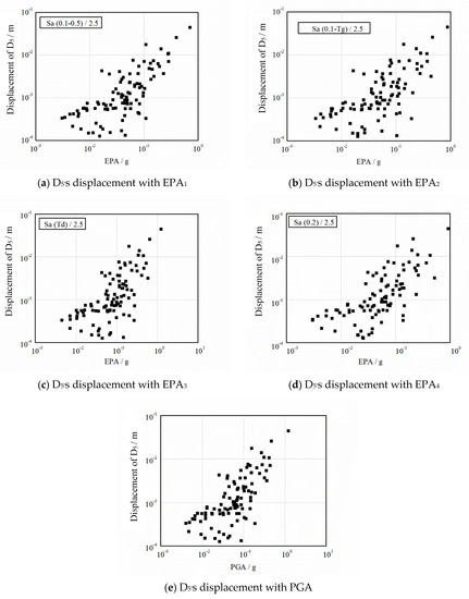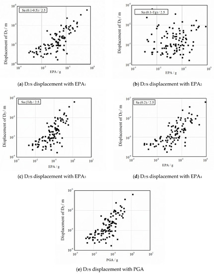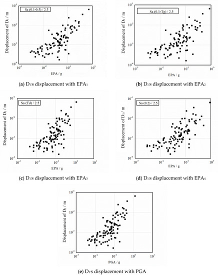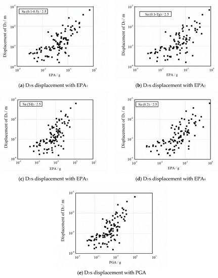 The final displacements of the 5 displacement observation points D1-D5 in the slope under the corresponding ground motion were extracted, and their corresponding relationships with PGA and EPA under the four definitions were made, as shown in Figure 2, Figure 3, Figure 4, Figure 5 and Figure 6, to study their change rule with EPA and PGA.