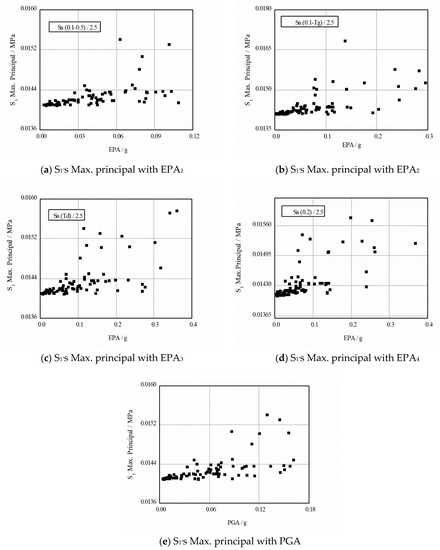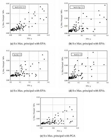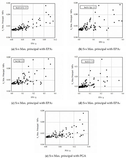 The maximum principal stress of three stress observation points S1, S2 and S3 under corresponding ground motion was extracted, and their corresponding relationships with PGA and EPA under four definitions have been made, as shown in Figure 7, Figure 8 and Figure 9, in order to study its change rule with EPA and PGA.