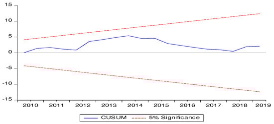 Brown, et al.; Pesaran and Pesaran [103,104] proposed the function of the CUSUM or CUSUMQ stability parameters test created by [103] following the coefficient estimation of the short and long run to inspect robustness. If the CUSUMQ or CUSUM line remains within the top and lower bounds of the CUSUM and CUSUMQ graphs, the estimated parameters are said to be stable. Figure 2 illustrate that the upper and lower bounds of the lines are both inside the CUSUM sta-bility graphs. On the other hand, both graphs show that the parameters are stable.