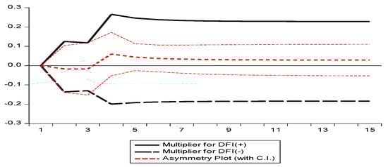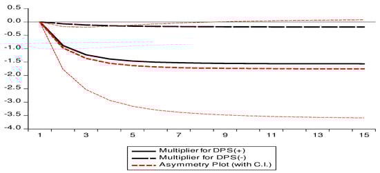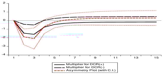 The Wald test of asymmetry is essential in the context of cointegration. The Wald test of the asymmetry result is included in Table 5. Furthermore, the term “asymmetry” does not refer to equal means. Thus, Table 5 shows that the probability value is less than 5%, so the null hypothesis of no asymmetry can be rejected. It is concluded that coefficients are not equal and that the presence of asymmetry is confirmed.