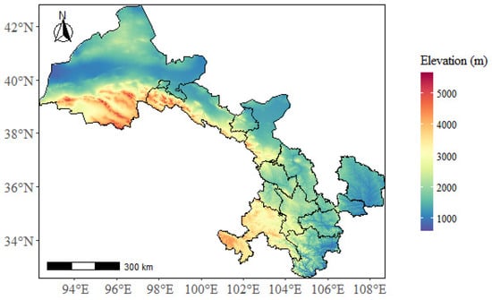 In the high and middle reaches of the Yellow River, the western Chinese province of Gansu is located between poles 32°11′–42°57′ N and 92°13′–108°46′ E [] (Figure 1). The overall area of Gansu province, which makes up 4.72% of China’s total area, is 454,430 square kilometers, with an east–west length of 1659 km and a north–south breadth of 530 km. The climate diversity, biological diversity, and landform diversity are highly apparent because the east and west are long and narrow. The Yellow River, the Yangtze River, three inland river basins, and nine river systems are the principal sources of water in Gansu province. Grassland and woodland make up most of the province’s land types, followed by cultivated land. As of the end of 2018, 119 different types of minerals have been found there. The province receives 400 mm of rain on average each year, and the average annual temperature ranges from 4 to 15 °C, depending on the location []. There is a lot of sunshine, and the temperature swings dramatically. The province’s primary economic sectors, including farming, forestry, industrial, animal rearing, tourism, and the ecological environment, greatly impact the provincial economy.