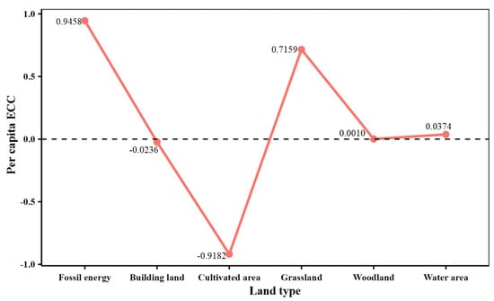 According to Figure 6, the per capita ECC in Gansu province from 2010 to 2012 showed a steady decline, i.e., the unsustainable development status of Gansu province was eased. However, per capita ECC in Gansu province increased gradually between 2012 and 2015, indicating that with the change in the economy and the improvement in living standards, as the consumption of biological resources and fossil energy continues to increase, the sustainability of Gansu province will decline year by year and the contradiction between social and economic development and environmental resource management will become more obvious. The Gansu province’s per capita ECC fell between 2015 and 2018, indicating that the province’s resource utilization rate is increasing but can still be improved. Per capita ECC in Gansu province rose sharply from 2018 to 2020, and the state of unsustainable development still needs more attention.
