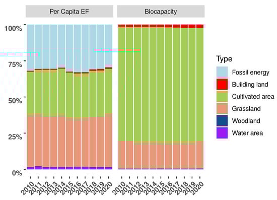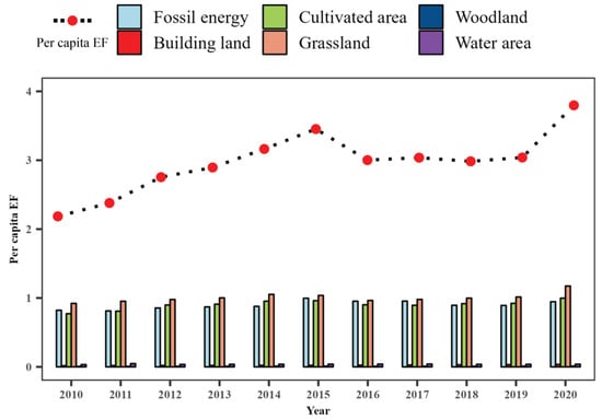 The EF, which includes the volume of total resource consumption in a given area and the scale of resource availability, is the total amount of land resources utilized by human activities. It also exposes the ecological threshold for sustained human life []. It consists of six different types of land resources: fossil energy, building land, cultivated area, grassland, woodland, and water area. The six lands produce differently on average. For the purpose of comparing the calculations, an equilibrium factor was multiplied by each land type, and EF was then computed using the weight of the biologically productive land area. This is the calculation’s formula.