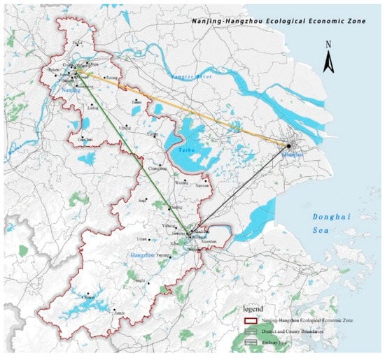 Regional coordinated development is a balanced concept of development that encouraged the coordination of factors among regions, and achieves regional cooperation, sharing, and win-win results. This new development concept includes promoting the integrated development of national major regional strategies with urban agglomerations, establishing a new model whereby central cities lead the development of urban agglomerations. Urban agglomerations drive regional development and promote integrated and interactive development among different regions and sectors [1,2]. Early in 2010, the Chinese State Council approved the implementation of the Yangtze River Delta Regional Planning, proposed to vigorously build the Nanjing-Hangzhou Economic Belt. In 2018, the integrated development of the Yangtze River Delta became part of a national strategy. The continuously increasing national strategic orientation provided a steady stream of external power to construct the Nanjing-Hangzhou Economic Belt.