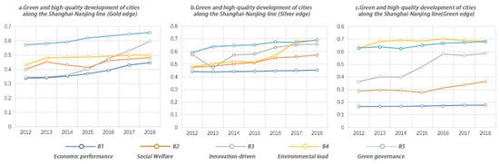 The five subsystems of green and high-quality development in the Shanghai-Nanjing-Hangzhou urban agglomeration all show a trend of overall steady improvement over the development time sequence. However, there are some spatial and temporal differences in the level of green and high-quality development among cities or urban belts (Figure 3). From the perspective of economic performance, the economic development level of the cities along the Shanghai-Jiaxing-Hangzhou line is the highest, with the index ranging between 0.439 and 0.452. The cities along the Shanghai-Nanjing line are second highest, with the index ranging from 0.338 to 0.447. The cities along the Nanjing-Hangzhou railway line are the lowest, with the index ranging between 0.165 and 0.177. This demonstrates that the economic performance of the cities along the Nanjing-Hangzhou railway line is low and also confirms the characteristics of the economic “weak side” with respect to the development axis of Nanjing-Hangzhou.