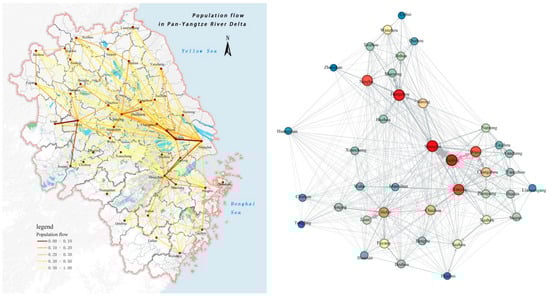 Population migration data were collected from the 2018 Spring Festival migration database within the Tencent location big data website. Population flow was spatially visualized for the Yangtze River Delta region using the XY-to-line tool of GIS. The Gephi social network analysis software was used to construct a hierarchical network illustrating the degree of connection between population nodes for prefecture-level cities in the Yangtze River Delta region. The “core-periphery” theory was used to clarify the spatial structure characteristics of population flow in the Yangtze River Delta region. The traffic commuting data were collected in a batch format through the map interface developed by Baidu. Based on the comprehensive traffic travel mode, we calculated the time needed to travel between the centroids of counties and cities along the Shanghai-Nanjing-Hangzhou line and visualized the OD connection using GIS.