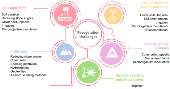 Overview of engineering solutions to overcome the challenges of steep slope revegetation. (*)Biocementation may be used for structuring the soil and stabilize mine residues in specific environments, such as those rich in iron.