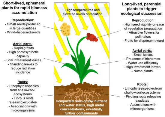 Thus, promising species should couple high photosynthetic activity with high water-use efficiency and desiccation tolerance, similar to C4 or CAM plants [183]. Furthermore, small plants with sclerophyllous leaves and photosynthetic tissues covered by trichomes are more promising for target environments than species without these adaptations [184]. Plants adapted to oligotrophic ecosystems should be preferred over nitrophilic species, and species able to increase nutrient and/or water uptake by acidic root exudates [185] or interactions with spontaneously establishing or inoculated microorganisms such as rhizobia or mycorrhiza are highly welcome [186]. Finally, small-seeded species or species with seeds featuring adhesive structures, attributes generally related to better dispersal [187], should facilitate fixation on steep slopes, especially of self-seeding generations that should attach to the slope surface without the application of fixing components such as those applied during hydroseeding procedures (Figure 3).