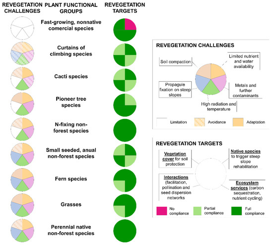 Adaptations to revegetation challenges and compliance with revegetation targets of different plant functional groups.