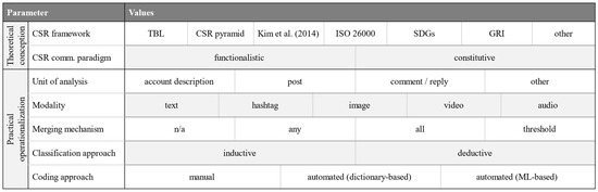 Another problem when operationalizing CSR communication in social media is multimodal content. This refers to content that includes several media types such as a combination of images and texts. In our literature sample, most authors classify social media content purely based on texts. This may be sufficient for social media platforms that are heavily text-based such as Twitter. However, in recent years, there has been a clear trend towards more visually oriented social media channels. Platforms such as Instagram, YouTube, and TikTok have all experienced substantial growth in user numbers. While the use of TikTok for corporate communications is still in its infancy, Instagram and YouTube are important communication channels for many companies that seek to establish a direct relationship with their stakeholders. Among other things, these channels have been used for CSR communication [18,39,75,76]. While the visuals in these channels are typically accompanied by a descriptive caption, it is questionable whether a purely text-based classification of content is sufficiently accurate. Therefore, authors need to make a conscious decision about which content components to draw upon for their classification and how to resolve potential discrepancies between them.