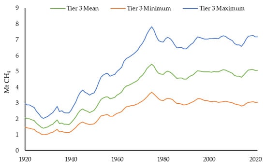 Mean, minimum, and maximum of CH4 emissions (Mt) using Tier 3 methods from 1920 to 2020.