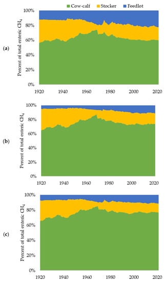 Cattle are implicated as a major source of increased methane emissions due to reported increases in population size [2,17,18]. However, the structure of the U.S. beef industry has changed over the last 100 years; notably, the proportion of the population represented by each animal class has changed. In some regions, cow body weight has increased; and in some systems, cattle are finished in a shorter amount of time. As a result of these industry changes, changes in methane emissions may not be directly (linearly) aligned with changes in total cattle population.