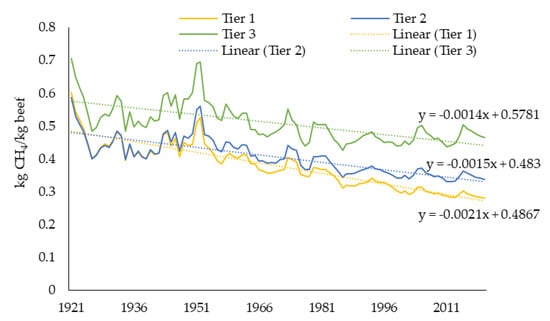 Enteric methane intensity (kg/kg beef produced) from 1921 to 2020 using Tier 1, 2, and 3 methods. Standard errors of the slope parameter for Tier 1 = 0.000102; for Tier 2 = 0.000113; and for Tier 3 = 0.00015.