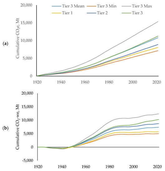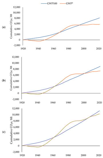 Comparison of cumulative CO2e emissions using GWP100 and GWP* based on (a) Tier 1 methodology; (b) Tier 2 methodology; (c) Tier 3 primary equation.