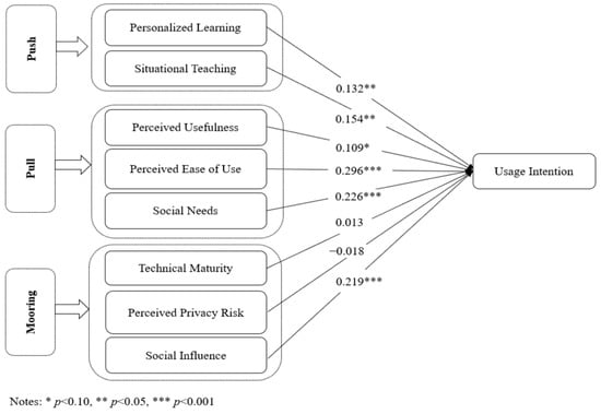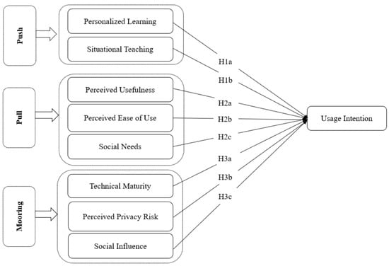 According to the PPM model, the push factor refers to the factor that pushes users away from the traditional education application platform [53]. In combination with the purpose and demand of this study, personalized learning and situational teaching are taken as the thrust factors of users’ willingness to use the metaverse education application platform. Personalized learning means that users can formulate their own learning plans through the metaverse education application platform. Ma et al. [54] studied the key factors affecting personalized learning and resource recommendation by taking the intelligent learning environment as the research object. Lv et al. [55] believed that in the era of artificial intelligence, personalized learning is the mainstream of future development, and the platform should provide users with a stronger independent learning environment. Xiao et al. [56] verified the impact of personalized demand on the application of library virtual reality technology. Situational teaching means that the metaverse education application platform can provide users with an immersive, vivid, and interactive teaching mode. Liu et al. [57] found through teaching experiment research that an immersive virtual environment can promote users’ understanding and application. Yuan et al. [58] took the academic virtual community as the research object and analyzed the positive impact of interaction intensity on users’ perceived learning. Based on the above analysis, the following research hypotheses are proposed: