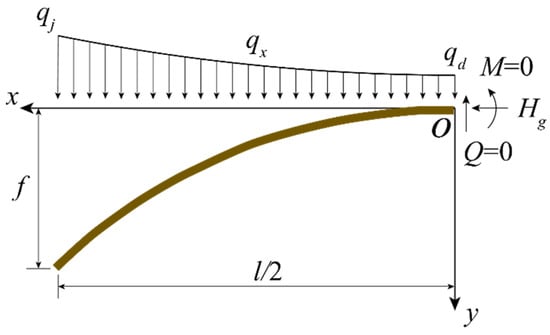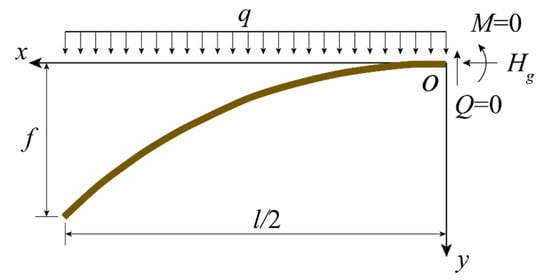 As shown in Figure 1, a half-span arch is subjected to the uniformly distributed load with the density of q (N/m). l (m) and f (m) are the span length and rise of the arch, respectively. M (N·m), Hg (N) and Q (N) are moment, axial force, and shear force at the apex of arch, respectively. By setting the origin of the coordinate at the apex of arch, the parabolic curve of the arch axis is formulated as:
