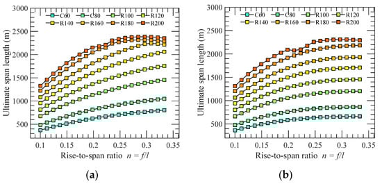 Ultimate span length of steel arch bridge: (a) Parabolic arch axis; (b) Catenary arch axis.