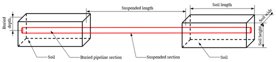 The suspended pipeline triggered by natural disasters can be simplified as a pipeline with two rectangular soil masses at the ends of the pipeline, as shown in Figure 1. The geometric size of a soil mass is characterized by its length, width, and height. The pipe consists of three parts: the suspended section, the buried section on the left, and the buried section on the right. The buried depth indicates the length between the pipe centerline and the upper surface of the soil mass.