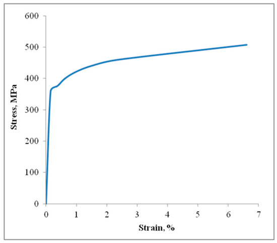 For investigating the rupture mechanism of suspended pipes, the parameters of a real suspended pipeline triggered by a flood are used as the input of the geometric model. The total pipe length is 480 m; the diameter equals 219.1 mm, with a wall thickness of 6.4 mm, including a suspended part is 320 m. The length of one side soil model is 80 m in length, 4 m in height, and 4 m in width, and the buried depth is 2 m. The transmission medium of the pipeline is oil; with a density of 840 kg/m3. The internal pressure is 4 MPa. The pipe is produced by API X52 pipeline steel. This pipeline steel is always applied in low-medium pressure transport of oil and gas. Figure 2 shows the nonlinear relationship between the stress and strain of the pipeline steel. The yield strength σy is 375 MPa, and the other mechanical parameters are shown in Table 1.