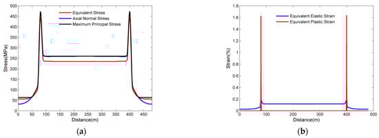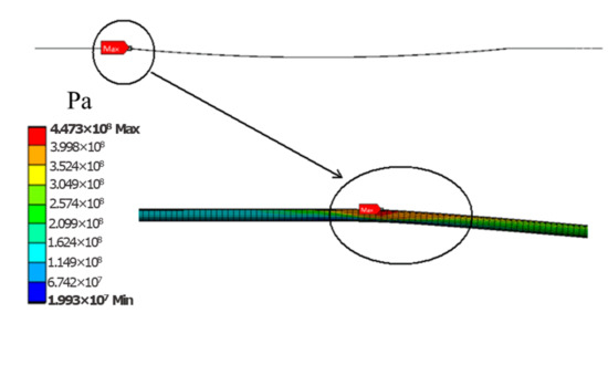 The FEM model of the suspended pipeline with a length of 320 m is solved, considering the plastic nonlinear behavior of the pipeline steel and nonlinear contact between the pipeline and soil, as well as the pipe mass and the transferred oil. Figure 4 shows the equivalent stress along the pipeline. The stress concentration locations appear on both ends of the suspended pipeline section. The distribution of the equivalent, axial normal, and maximum principal stresses along the pipeline is shown in Figure 5a. The results indicate that the three stresses along the pipeline show similar varying tendencies, and the curve of the normal stress coincides with the curve of the principal stress. Therefore, the axial stress caused by the suspended pipeline is a leading factor in the process of pipeline failure. For the following analysis, both the equivalent stress and the axial normal stress are considered. The critical locations in which the ES exceeds the pipeline yield stress appear at both ends of the suspended section. The length of the critical location is 0.9 m, and the MES is 447.3 MPa, which is 1.19 times the yield limit.