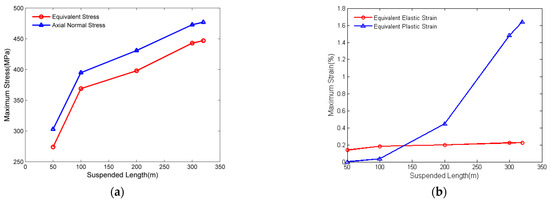 Figure 7b depicts the values of the MES, elastic-strain, and plastic-strain in terms of the suspended length. As shown in Figure 7b, the plastic strain appears when the length exceeds 50 m. Elastic deformation is the main cause of pipeline strain when the length does not exceed 100 m, while plastic deformation becomes the dominant factor when the suspended length is over 150 m. The plastic deformation rapidly increases while the elastic changes slightly in the plastic deformation stage.
