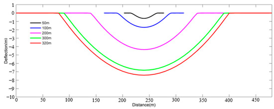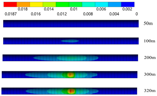 The total strain in the critical location under different suspended lengths is illustrated in Figure 8. The critical locations rapidly enlarge with increasing the suspended length and the maximum value ranges from 0.13% to 1.87%. Figure 9 shows the deflection along the axial varies with the length. The maximum deflection of the pipeline with a 320 m suspended length improves to 7.4 m, which is 12.6 times that with a 50 m suspended length. As a result, the suspended length has a significant influence on the failure process.