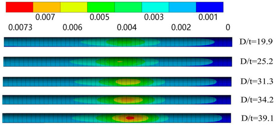 Total strain contours of the location of the maximum strain versus the ratio of diameter to thickness (D/t).