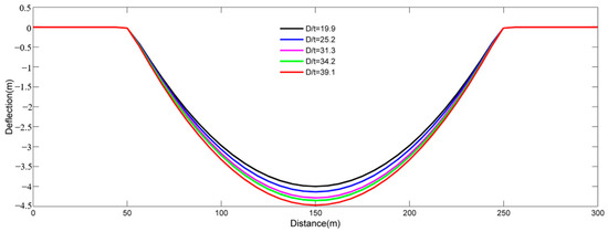 The deflection distribution along the pipeline is shown in Figure 6. The maximum deflection of this pipeline is 7.4 m, which is far more than the accepted value in oil and gas pipeline engineering. The deflection should not be more than 0.005 times the suspended length in China [40]. The deflection along the pipeline also distributes symmetrically and the maximum deflection is located at the midpoint of the suspended pipeline section. Meanwhile, the real deflection is 7.1 m, which approaches the calculation value. It concludes that the nonlinear FEM, which is employed for analyzing the suspended pipeline, has strong feasibility. As the case results by the nonlinear numerical method, the maximum equivalent stress has exceeded the yield stress of X52 and the serious plastic strain occurs in the critical location. The suspending of the pipeline can lead to serious risks to the safety operation of pipelines. Nevertheless, the failure process of the suspended pipe is unclear. In the current study, factors such as the suspended length, the ratio of diameter and thickness, and the fluid mass, which influence the failure of the suspended pipeline, are analyzed to grasp the failure mechanism and critical influence factors.