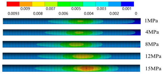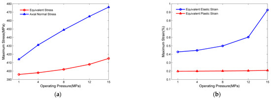 Figure 13a presents the values of the MES and the MAS under different operating pressure. The results show that the maximum equivalent stress rises just 4.7% when the operating pressure improves sharply from 1 Mpa to 15 Mpa. As shown in Figure 13b, the equivalent plastic strain presents a low growth rate while the operating pressure is less than 12 Mpa.