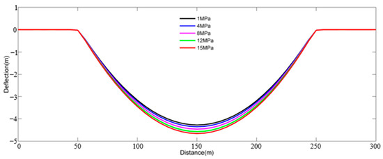 The total strain at the critical location for different operating pressure in Figure 14 also shows that the operating pressure has a slight influence on the strain. The numerical results also reveal the relation between the suspended pipeline deflection and the operating pressure in Figure 15. The maximum deflection slightly improves by 9.0% to 4.66 m while the operating pressure increases from 1 MPa to 15 MPa. Therefore, we can conclude that normal pressure is not critical for the failure of the suspended pipes.