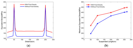 (a) The equivalent stress along axial and (b) the maximum equivalent stress under different values of the suspended length versus the fluid gravity.