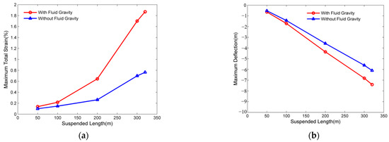 Figure 17a depicts the maximum total strain under different values of the suspended length versus fluid gravity. The results demonstrate that the strain rises with increasing length. The relative difference is 40% when the suspended length is 50 m, and the relative difference is 144%.