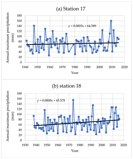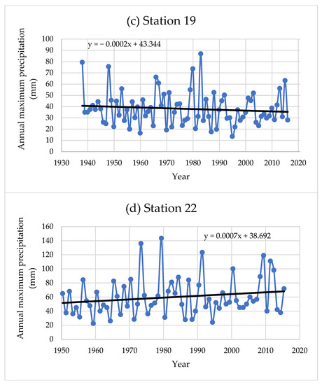 The annual maximum precipitation (mm) time series with the straight line represents the data series’s linear trend line for the selected stations.