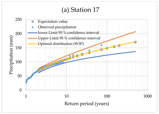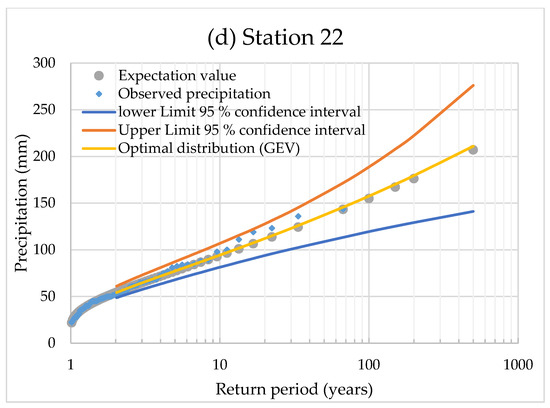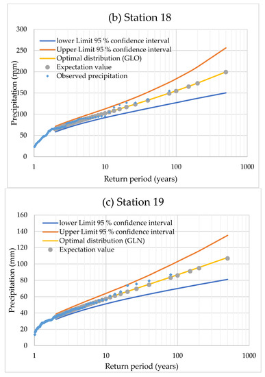 Based on the KS test (Table 3), the AM series best-fit distribution for stations 17, 18, 19, and 22 was the W3P, GLO, GLN, and GEV, respectively. These findings suggest that various distributions may suit the AM series for various stations. As a result, it is emphasized that an uncertainty analysis should be conducted using the best-fit probability distribution for extreme precipitation data series rather than a predefined single probability distribution based on modern extreme value theory. As a result, the best-fit distribution at each station was used for the uncertainty analysis at that station, which is the innovative aspect of this paper. This will reduce the uncertainty in the predicted extreme precipitation value associated with selecting the proper probability distribution for the given extreme data.