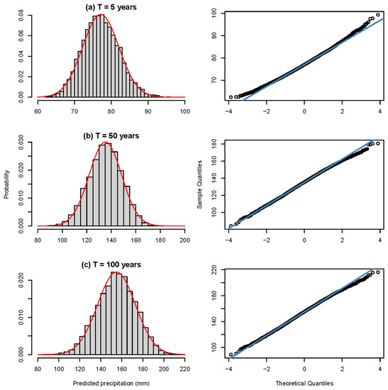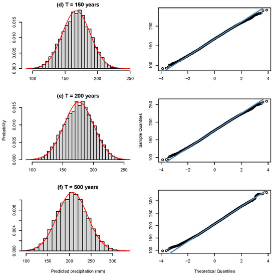 Figure 4 depicts a histogram as well as a normal quantile plot of the bootstrap sampling distribution of extreme precipitation quantile (XT) for station 22 (as example). These plots indicate the sampling distribution of XT for the different return periods (i.e., different non exceedance probability). In a similar way, it was possible to obtain the sampling distributions of XT at any return period. For other locations, the findings are comparable to those displayed in Figure 4 and, as a consequence, they are not provided in this article as a separate figure. The findings from other locations are provided in Figures S1–S3 for the weather stations 17, 18, and 19, respectively, in the Supplementary Materials. This article utilized the normal quantile plot to determine if the sampling distribution of XT matched with a normal distribution.