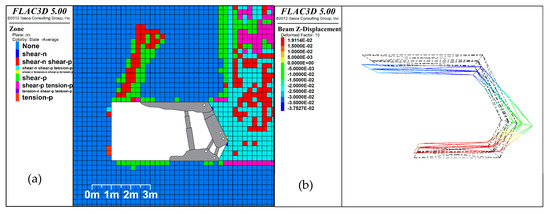 There are two stability indicators in this study, failure zone, and shield displacement. Failure zone is an area zone where the stresses fulfill the yield criterion. The mechanism of failure can occur in shear mode and tension mode [44]. This can indicate a possible roof fall, face collapse, and floor heave in the longwall face. For instance, an illustration of the failure zone from the simulation result in a 300-m depth case is presented in Figure 3a where “None” legend represents the non-failure zone and other legends represent the mode of failure. Although the ultimate goal is to maintain the stability of the longwall face, it is impossible to completely diminish the failure zone in the face during longwall operation. Thus, it is required to consider the allowable range of fracture control, above which the failure zone is exceeded, to consider that the roof is in poor condition. Zhao et al. [12] adopted 0.4 m as the allowable range for roof control. Due to the mesh size in this study, 0.5 m is adopted for this study as the allowable range of roof control. If the failure zone exceeds the 0.5 m range, the rock is considered in poor condition.