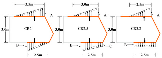 All types of shied support have the same canopy length of 3.5 m and base plate length of 2.5 m, shield width of 2 m, and working height of 3 m. The different component of each shield variation is the location of the leg, which results in different canopy ratios and hence different shield resistant stress distribution. The detailed stress distribution of the shield support with different canopy ratios are shown in Figure 6. For the case where the canopy ratio is 2, the position of the leg is at the one-third length of the canopy from the back of the plate, resulting in a triangular distribution of resistance stress on the canopy plate. The ideal leg position at the base for this case is one-third length of the base from the front of the base, which results in a reverse triangular distribution, compared to the canopy. As shown in Figure 6, when the canopy ratio increases, the leg position becomes closer to the back of the canopy. As the leg position is close to the back of the canopy, the distribution of resistance stress is concentrated in the back portion of the canopy leaving the front portion of the canopy without any resistance stress. The leg position at the base also moves toward the center of the base when the canopy ratio increases. This can cause the resistance stress distribution at the base to become a trapezoidal shape when the leg moves close to the center, or a rectangular shape when the leg is at the center of the base. Table 4 demonstrates the conversion value of the different leg resistance forces to the applied boundary stress for each type of shield support. These values are obtained by converting the resistance force of the shield legs to the surface resistance stress according to the distribution shape of the resistance stress for each canopy ratio shown in Figure 6. For CR2 as an example, the resistance force of 6000 kN is distributed the force to 3.5 m × 2 m plate of the canopy. Since the distributed load is known to be triangular distribution, the highest point of this triangular distributed load ‘A’ is equal to 6000 kN/(3.5 m × 2 m) × 2 which is equal to 1.71 MPa.