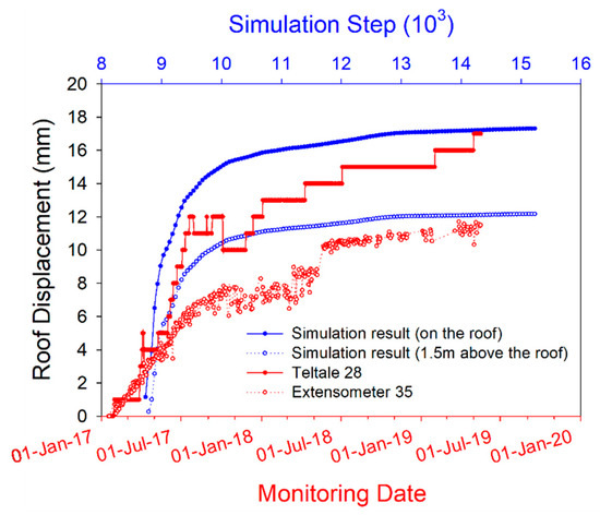 The installation of telltale and extensometer on the roof of the main gate provided a vital roof displacement for validating the model. Telltale 28 and Extensometer 35 are selected for model validation due to their similar condition in terms of cover depth with the overburden thickness of the global model which is 50 m. The actual cover depth of these devices is 45 m. Therefore, the overburden of the model is adjusted to 45 m to accurately simulate the actual conditions for model validation with the assumption that the initial stress ratio is 1. Telltale is used to monitor the displacement on the roof. The extensometer, on the other hand, can record roof movement or displacement from 0.3 m to 6 m above the roof with the interval of the anchor point of 0.3 m. However, the obtained results from the extensometer from anchor point 0.3 m to 1.2 m display a highly fluctuating value which could result from a large fracture on the roof which possibly affects the anchor point within this range. As a result, roof displacement result from this device is monitored at 1.5 m above the roof. The results of roof displacement from the numerical simulation are measured at two points. The first point is on the roof and the second point is 1.5 m above the roof. These results are compared with the recorded data from the aforementioned devices. The compared result is shown in Figure 7. Since the evolution of roof displacement in the simulation process is based on the simulation step, there is no suitable method to convert these simulation steps to the actual time frame to compare with the field monitoring data which is recorded in the specific time frame. However, this simulation result is meant to illustrate the static snapshot of the model during its equilibrium state. Likewise, the evolution of roof displacement in field measurement devices will be stationary when it reaches an equilibrium state. According to Figure 7, the evolution of roof displacement in the simulation reaches the maximum value of 17.3 mm on the roof and 12.2 mm at 1.5 m above the roof, which are in great agreement with the field monitoring results from both devices whose values are 17 mm and 11.5 mm, respectively.