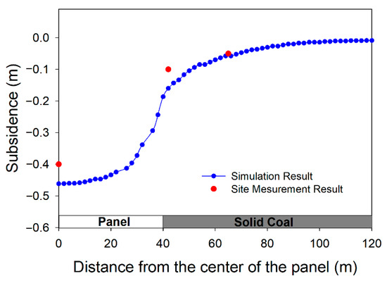 In the study of surface subsidence by Sasaoka, et al. [20] which is located near the study area, surface displacement is monitored during longwall operation. The monitoring stations are arranged into two lines, namely line 1 and line 2, above the operated longwall panel. Line 2 is selected for a validated simulation model due to its resemblance of cover depth around 50 m. The panel width of the global model is adjusted to fit the actual panel width of 80 m in the compared study. However, the working thickness cannot be adjusted to fit the 2 m of the compared study as it will affect the overall model mesh, shield configuration, and interaction between the shield support and rock surrounding the longwall face which could result in an inconsistent analysis result in the global model. Thus, the working thickness is kept at 3 m. There are three surface movement monitoring stations located along line 2, which begin from the middle of the working panel. Longwall face had been retreated approximately 100 m before reaching monitoring line 2. The field result is recorded when the longwall face passed line 2 roughly 2.8 m. In the modeling, the panel retreats for 100 m length after which the surface displacement is exported from the 97 m length which is 3 m behind the longwall face. The compared result is illustrated in Figure 8. The maximum surface subsidence in the middle of the panel from the simulation is slightly higher than the actual field measurement. It is to be expected since the working thickness of the simulation is thicker than the actual field. However, the overall trend of the surface displacement profile is still consistent between the simulated and measured results. This confirms the validity and usability of the numerical model proposed for this study.