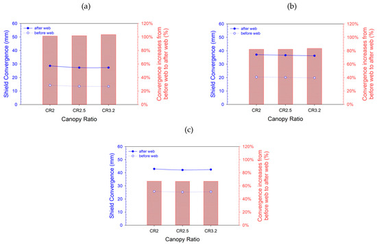 Shield convergence under the influence of canopy ratio: (a) 100 m, (b) 200 m, (c) 300 m.