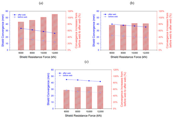 Shield convergence under the influence of shield resistance force: (a) 100 m, (b) 200 m, (c) 300 m.